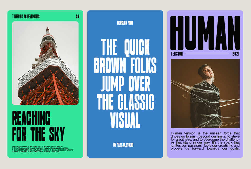Whether you're aiming for a relaxed and sensuous vibe or seeking a more versatile and dynamic look, Norguba has got you covered. It’s perfect for brand identities with heart, packaging, and genuine, effortless messaging. Posters, billboards and motion graphics that fly off the screen.